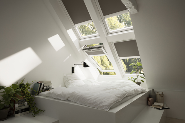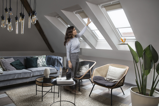 Vzhledem k tomu, že rolety VELUX jsou k dispozici v manuální i dálkově ovládané verzi, není regulace světla problémem ani u vysoko umístěných střešních oken. Rolety VELUX s vestavěným motorem lze snadno ovládat dálkovým ovladačem, mobilní aplikací VELUX App Control nebo dokonce automaticky po zapojení do systému VELUX ACTIVE with NETATMO.