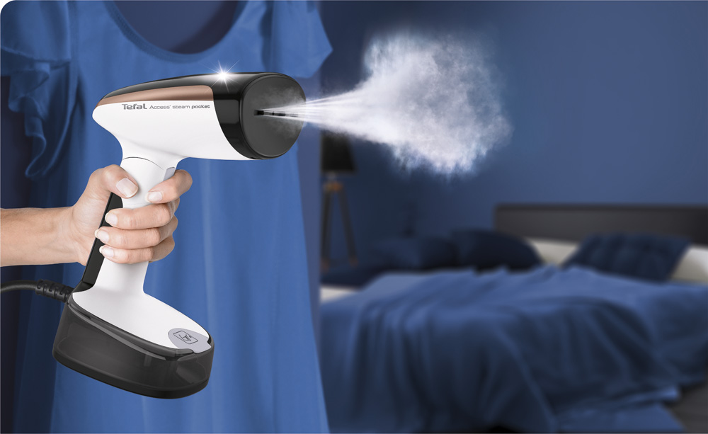 Výhodou napařovacího zařízení je, že dokáže rychle narovnat pomuchlané textilie bez nutnosti manipulace s žehličkou a žehlicím prknem. Ruční napařovač Tefal Access Steam Pocket stačí naplnit vodou, připojit do elektrické zásuvky a za patnáct vteřin už je připravený k akci. Po stisknutí tlačítka se uvolní pára a svislým přejížděním hlavy napařovače těsně nad povrchem oblečení se odstraní záhyby, pomuchlaná látka se narovná a oděv dostane správnou formu. Působením horké páry se textil také vydezinfikuje.