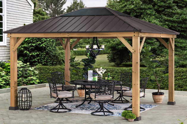Vytvořte si jedinečné místo v zahradě s naším zahradním altánem Gazebo BRURI z cedrového dřeva. Jeho valbová střecha je vyrobená z kvalitní hnědé oceli a polykarbonátu a spolehlivě vás ochrání před sluncem i deštěm a zároveň umožní pronikání přirozeného světla díky vestavěnému světlíku. Altán o rozměru 393 × 335 cm propojuje přírodní krásu cedrového dřeva s moderními prvky a poskytuje příjemný prostor pro relaxaci nebo společenská setkání s rodinou a přáteli. Vestavěné dvojité kolejnice, umožňují snadné zavěšení sítě proti komárům nebo závěsu pro větší soukromí.