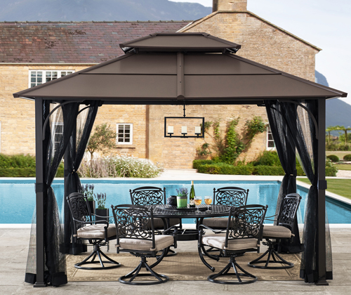 Plánujete zahradní slavnost s rodinou či přáteli nebo si chcete jen tak posedět venku s knihou a dobrým pitím a současně mít jistotu, že vám plány nezkazí rozmary počasí? To hravě vyřeší prostorný zahradní altán Gazebo KALDI o rozměru 366 × 307 cm. Jeho základem je pevný ocelový rám s ochranným nátěrem proti rezavění. Altán má uzavíratelné síťové bočnice se všech stran, které vás chrání před dotěrným hmyzem. Dvoupatrová valbová střecha je vyrobena z kvalitní oceli a ošetřená práškovým nástřikem. Má průchod proti silnému větru a spolehlivě vás ochrání před sluncem i lehkým deštěm.