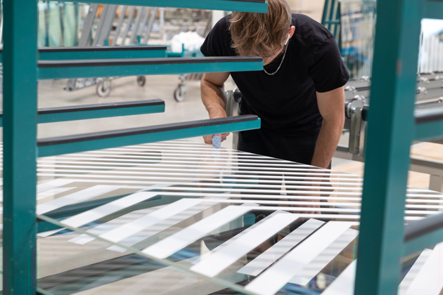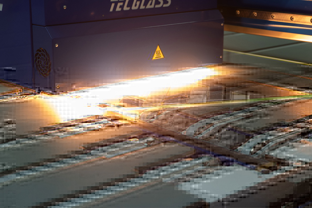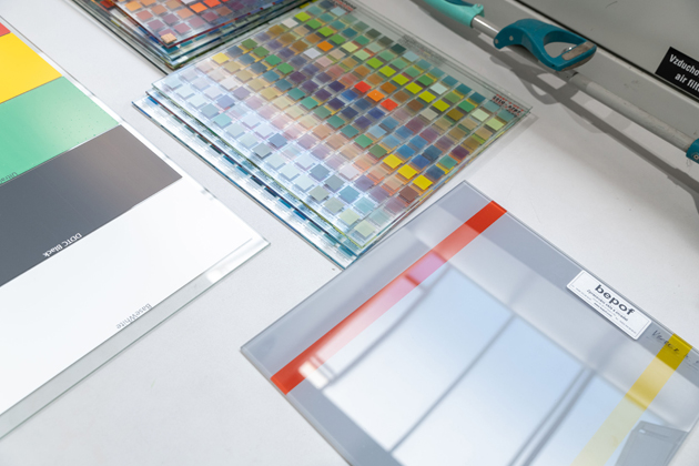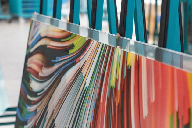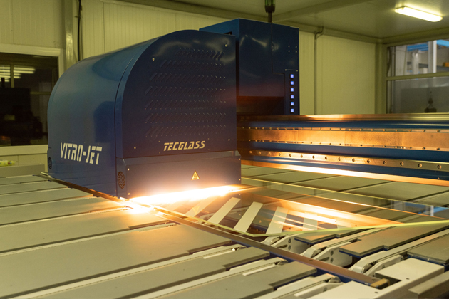 Dokonalým příkladem jsou digitálně potištěná skla. Při jejich výrobě se klade důraz na kvalitní přípravu tiskových dat, aby bylo dosaženo maximální ostrosti v detailu. Výrobní proces začíná aplikací keramických barev na skleněnou tabuli pomocí digitální tiskárny. Po sušení a vizuální kontrole následuje pečení barev do povrchu skla v kalicí peci při teplotě okolo 620 °C. Tato technika umožňuje tisknout na skla i s nepravidelnými tvary, která lze následně začlenit do různých typů vrstvených skel.