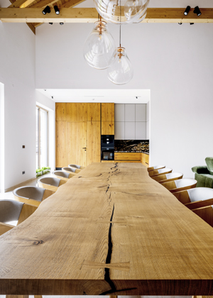 Kuchyň (Sargánek) z masivního dubu a dubové dýhy s kamennou deskou a obkladem odráží blízký vztah majitelů k přírodě → www.sarganek.cz