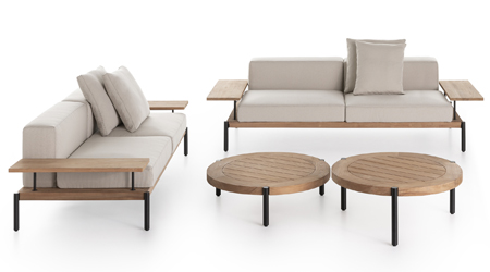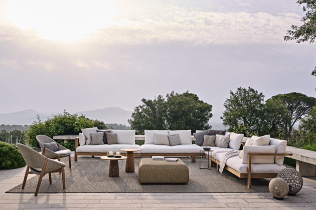 Sofa Pure (Tribù), design Andrei Munteanu, masivní dřevina, outdoorová textilie, dvoused, cena od 189 390 Kč → www.konsepti.com