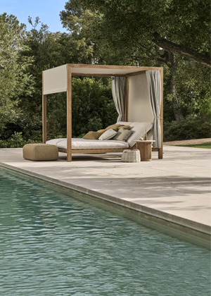 Foto: TribùDenní lůžko Pure Cabana (Tribù), týkový masiv, voděodolná outdoorová textilie, střecha a zadní stěna postele z textilie Sunscape, cena od 410 626 do 440 610 Kč → www.cskarlin.cz
