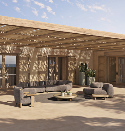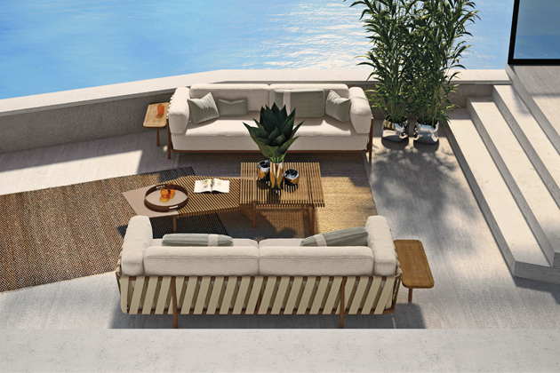 Foto: VondomNábytek z kolekce Milos (Vondom), design Jean-Marie Massaud, polyuretanová pěna, outdoorová textilie polyetylen, masivní dřevina iroko, ocenění Red Dot Design Award 2024, cena na dotaz → www.lino.cz