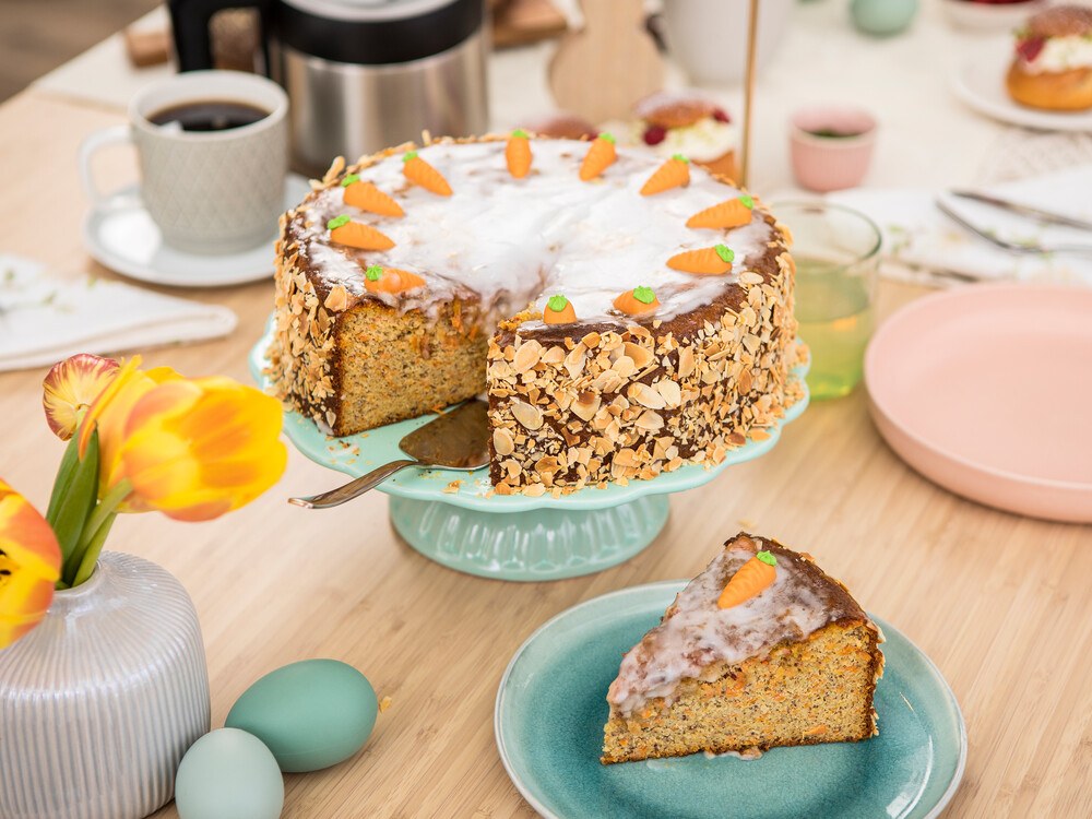 - Do větší mísy prosejte cukr, postupně přidávejte vodu a šlehejte dohromady, dokud nevznikne hustá, ale stále tekutá poleva. Vychladlý korpus potřete rovnoměrně nejdřív marmeládou a poté polevou. Ozdobte mrkvemi a mandlemi. Dobrou chuť!