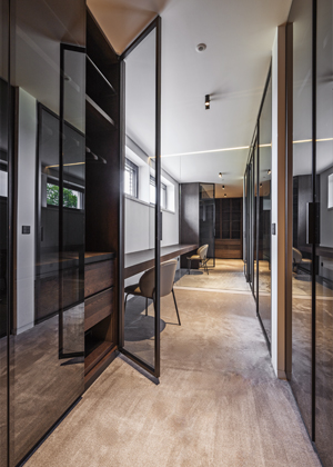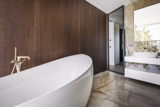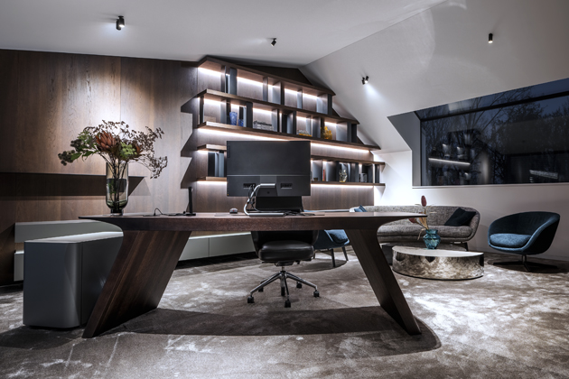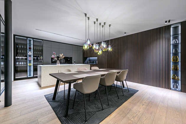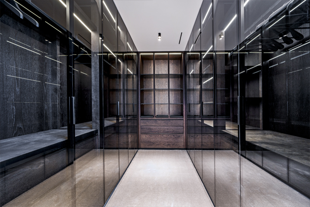 Majitel si přál navrhnout a realizovat moderní, luxusní, minimalistický interiér, který by byl pečlivě promyšlený do nejmenších detailů, s důrazem na kvalitu a preciznost provedení celého prostoru. „Bylo nutno vybrat konkrétní svazky dýh u našich dodavatelů. K této velmi zajímavé a odpovědné činnosti jsme ho přizvali, možnost ocenil a nevšední zkušeností byl i velmi potěšen. Pro konečný výběr odstínu mořené dýhy bylo nutno ve spolupráci s našimi designéry a lakovnou připravit několik velkoformátových referenčních vzorků. Po výběru finálního vzorku nábytku a obkladů jsme dokončili i výběr dlažeb, dřevěných podlah a schodů,“ objasňuje konkrétní kroky spolupráce designér Petr Tůma.