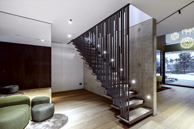 Výzvou pro designéra bylo promyslet a zrealizovat každý detail s naprostou přesností, bez ohledu na použitý materiál. Klíčovým prvkem designu se stala kombinace kovu a dřeva, která byla použita na zábradlích i obkladech stěn. Tvůrci designu považovali za důležité uplatnění mnoha detailů. Například atypicky profilovaných lakovaných dvířek na vysokých skříňkách či atypicky řešeného schodiště včetně kovového zábradlí nebo keramické pracovní desky v kuchyni. Prosazovali moderně a luxusně koncipovanou šatnu, která je ve vnitřní výbavě opatřena koženými doplňky. Její celkový dojem podtrhují velkoformátová prosklená dvířka. Veškeré prvky byly navrženy tak, aby dokonale korespondovaly s ambientním osvětlením, které prostoru dodává příjemný teplý nádech. Majitel měl zcela jasnou představu o výběru svítidel i sedacího nábytku, což designéry k vytvoření celého konceptu interiéru inspirativně podnítilo. Mořená dubová dýha na nábytku, obkladech i podlaze prostupuje celým interiérem. „Podle autorských návrhů bylo vyrobeno téměř všechno vybavení interiéru, a to v naší stolařské dílně,“ s hrdostí uvádí majitel společnosti Robert Sargánek.
