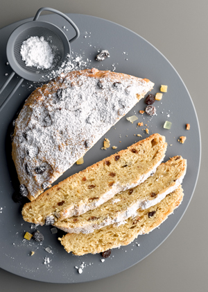 Droždí a vanilkový cukr rozpustíme v mléce a přikryté necháme kynout 15 minut. Rozinky, mandle a oranžát smícháme s rumem a necháme stranou. Mléko s droždím vyhněteme s máslem, moukou, solí, cukrem, kůrou z citronu a vejcem tak, aby vzniklo hladké těsto. Krátce vmícháme citronát, rozinky a mandle s rumem. Těsto v míse vložíme do trouby, přikryjeme vlhkou utěrkou a necháme kynout (horní/spodní pečení 30 °C, 60 minut). Z těsta na troše mouky vytvarujeme štolu o průměru asi 30 cm. Položíme na pečicí plech, vložíme do trouby a pečeme na 150–160 °C cca 55–65 minut). Rozpustíme máslo na potření, štolu tím ještě za horka potřeme a posypeme cukrem. Necháme vychladnout a na závěr hustě poprášíme moučkovým cukrem.