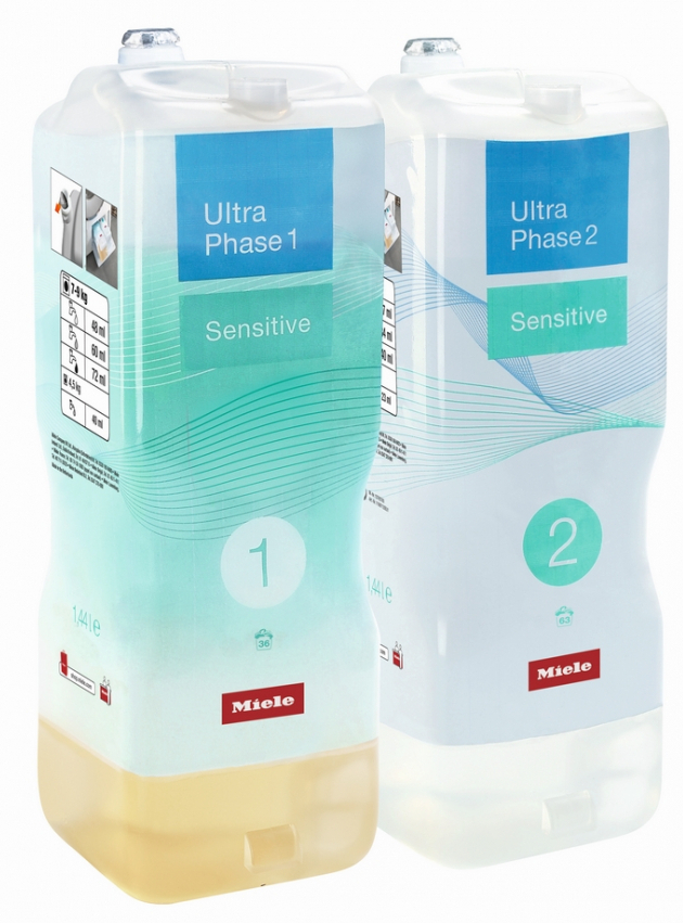Za perfektním výsledkem stojí také 2fázový prací prostředek Miele. Kromě tradičního přípravku UltraPhase nabízí Miele také vysoce koncentrovaný UltraPhase Sensitive. Ten je další odpovědí Miele na stále silněji vnímanou problematiku ochrany životního prostředí.