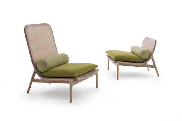 Křesílka Eben (Désirée), design Matteo Thun a Antonio Rodriguez, jasanové dřevo v přírodním nebo antracitovém odstínu, ratanový výplet, polštáře s koženým či textilním potahem, cena od 71 330 Kč www.puntodesign.cz