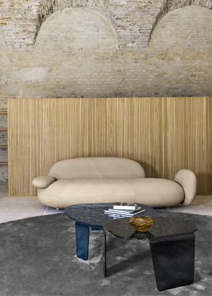 Kompaktní pohovka Litos (Prianera), Giorgio Ragazzini, inspirovaná oblými tvary oblázků, textilní či kožený