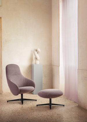 Křeslo a taburet z kolekce Nebula Lounge (Miniforms), design E-ggs, otočná hliníková základna, skořepina s textilním potahem, cena křesla od 58 484 Kč, podnožka od 23 249 Kč, www.cskarlin.cz