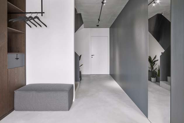 Přírodní podlaha Marmoleum Concrete 3727 a 3709 v kombinaci lineárního vzoru Marmoleum Striato 5232 (Forbo), doporučená prodejní cena 780 Kč/m2 bez DPH → www.forbo-flooring.cz