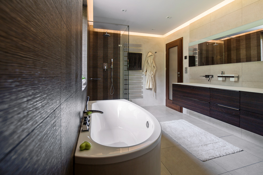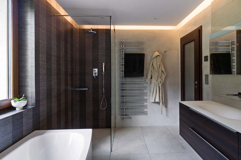 Protože ve studiu Glamur považují využití dispozic v koupelně za velmi důležité, navrhli přestavbu doslova z gruntu a nebáli se razantních změn. Na rozdíl od původního řešení soustředili sprchový kout a vanu do jedné části. Kout situovaný do rohu místnosti tvoří jen jedna skleněná příčka, která chrání prostor před stříkáním vody.