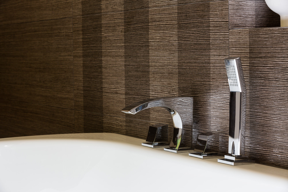 Volný vstup do koutu je od vany, tedy z mokré zóny, kde případné stříkání vody nevadí. Nad vanou s baterií zabudovanou do lemu je okno, které se odráží v protějším zrcadle, takže je v místnosti více denního světla. Na místě bývalého sprchového koutu je nyní toaleta s bidetem. Tato zúžená část místnosti není při vstupu do koupelny přehledná, takže poskytuje více soukromí.