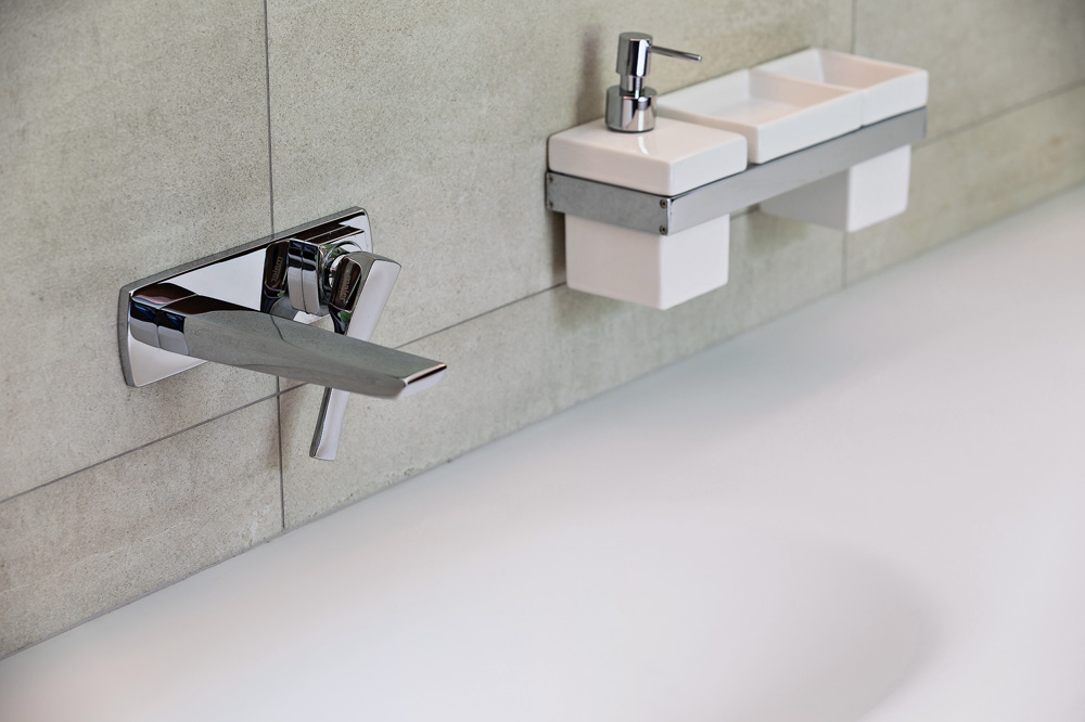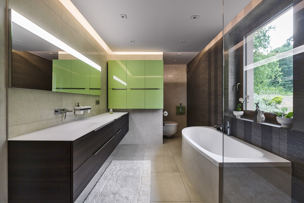 Díky úpravě dispozic a přemístění toalety se uvolnila část stěny, kterou návrháři využili k umístění sestavy s velkými úložnými prostory. Horní plochu široké umyvadlové skříňky tvoří skleněná deska s integrovaným umyvadlem. Toto řešení působí elegantně, a navíc splňuje požadavek paní domu na snadnou údržbu. Tu si při úklidu pochvaluje i u sanitární keramiky Globo ze série 4all. Toaleta a bidet jsou totiž v hygienickém provedení bez oplachového kruhu.