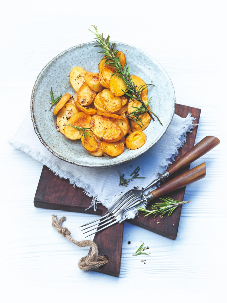 Na posledních 10 minut přidáme k bramborám polovinu rozmarýnové směsi a kostičky cibule a celeru. Nakonec posypeme zbylým kořením a ještě horké podáváme.