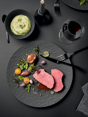 Hlavní chod: Rostbíf s rozmarýnovo-pepřovou kůrkou (č. 6); okurkový dip (č. 3); polníček s grepovým dresinkem a ořechy (č. 5 ); opékané bylinkové brambory (č. 1)