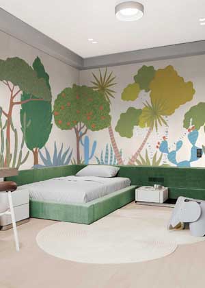 Každý motiv je jako cesta do jiné říše: od borovicového háje Campeggio Toscano, který evokuje kouzlo letního kempování, přes exotickou a pulzující džungli Guyany, až po zahradu Stranger Trees, kde bok po boku rostou ovocné stromy, kaktusy i stále zelené rostliny. Kolekci uzavírá hravý vzor Trova le arance (Najdi pomeranče), který se mění v příběh na stěně. Děti se v něm setkají s žirafou Ginou, krokodýlem Cocem nebo zajícem Leem a společně pomohou opici Bettě najít její ztracené pomeranče.