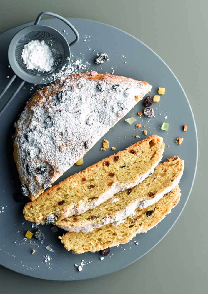 Droždí a vanilkový cukr rozpustíme v mléce a přikryté necháme kynout 15 minut. Rozinky, mandle a oranžát smícháme s rumem a necháme stranou. Mléko s droždím vyhněteme s máslem, moukou, solí, cukrem, kůrou z citronu a vejcem tak, aby vzniklo hladké těsto. Krátce vmícháme citronát, rozinky a mandle s rumem. Těsto v míse vložíme do trouby, přikryjeme vlhkou utěrkou a necháme kynout (horní/spodní pečení 30 °C, 60 minut). Z těsta na troše mouky vytvarujeme štolu o průměru asi 30 cm. Položíme na pečicí plech, vložíme do trouby a upečeme (horký vzduch plus 150–160 °C, 2. úroveň odspodu, 55–65 minut). Rozpustíme máslo na potření, štolu tím ještě za horka potřeme a posypeme cukrem. Necháme vychladnout, poté hustě poprášíme moučkovým