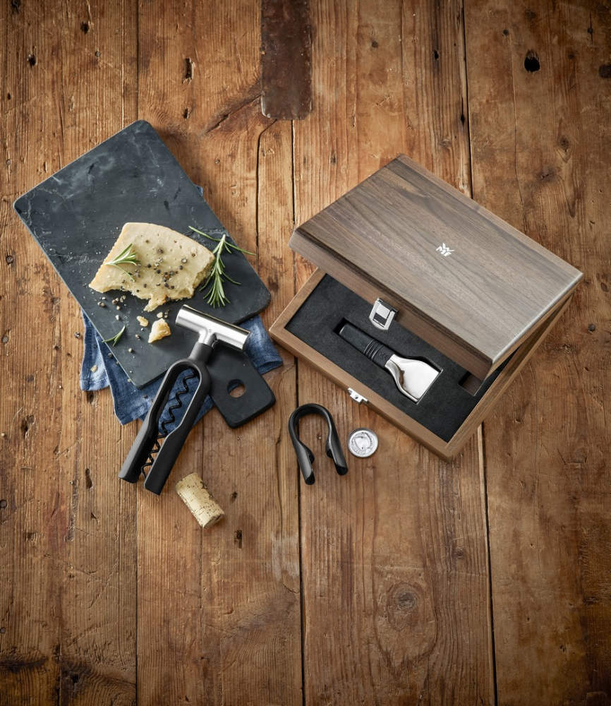 Set zahrnuje 5 profesionálních doplňků pro milovníky vína v krabičce z ušlechtilého ořechového dřeva (1x vývrtka, 1x řezačka fólií, 1x uzávěr na láhev, 1x nálevka, 1x otvírák na láhve).