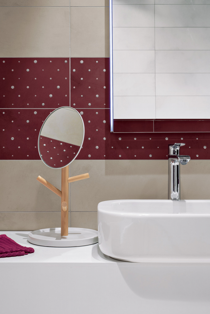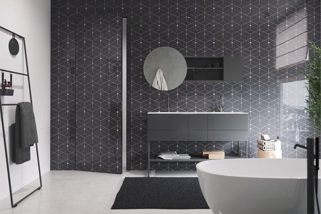 Široké možnosti pro vzhled koupelnových stěn nabízí také sofistikovaný obkladový systém Efekta od značky JAP. Dalším originálním řešením jsou obklady ze skla, které nabízejí prakticky neomezené možnosti vzhledového provedení.