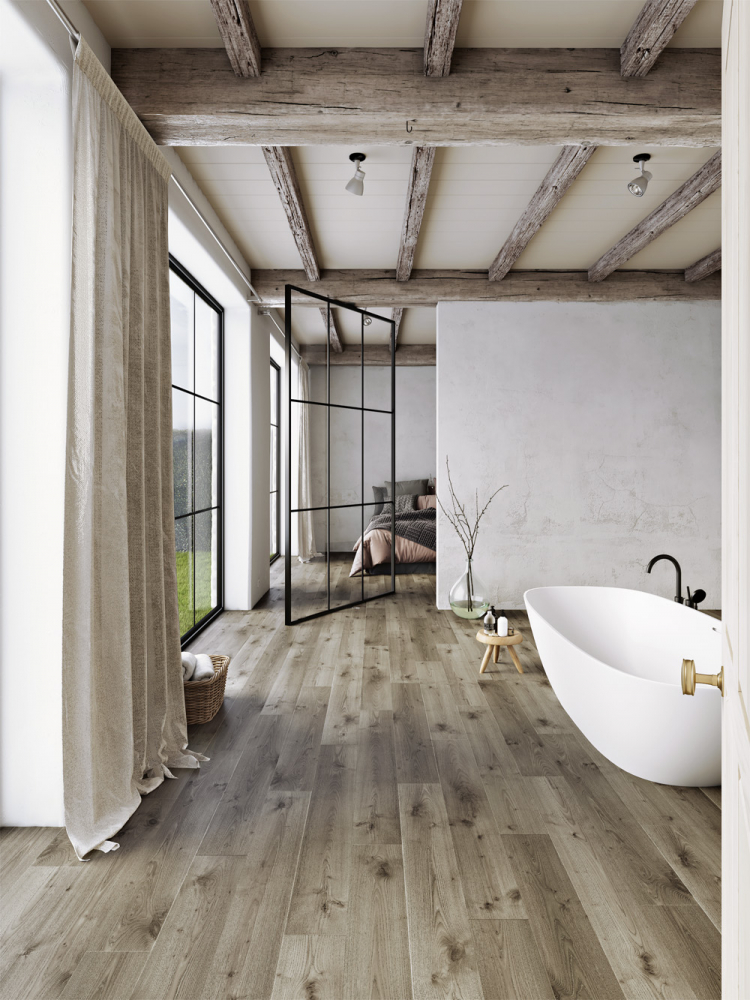 Ani laminátu se v koupelně vyhýbat nemusíte. Se 100% voděodolnou podlahou Traditions značky Balterio nemá voda šanci. Pokud jste zastánci jednoduchých změn, vyzkoušet můžete také široký výběr tapet nebo například inovativní obklad stěn Hüppe EasyStyle, který dostanete v prodejnách Koupelny Ptáček.