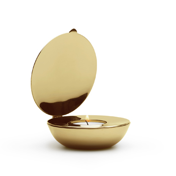 Foto: Design House StockholmSvícen Shell (Design House Stockholm), design Magnus Löfgren, vysoce leštěný kov s mosazí, Ø 10 cm, výška 3 cm, cena 1 790 Kč, www.la-conception.cz