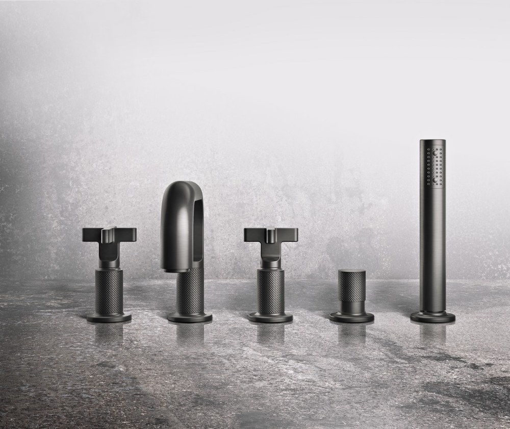 Baterie zapuštěné do okraje vany bývají tří až pětiotvorové a součástí je výsuvná ruční sprcha. Více než pákové ovládání se u nich využívají různé moderní podoby kohoutků.