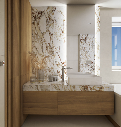Andrasia (Perfecto Design), design Ing. arch. Alexandra Kaščaková, realizace koupelny s velkoformátovou dlažbou v imitaci mramoru Cosmopolitan Arabescato Oro, formát 120 × 278 cm, cena 4 488 Kč/m2 → www.perfecto.cz
