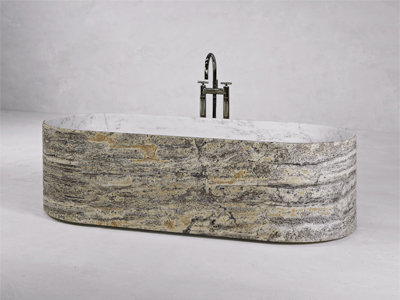 Foto: KreooBlessed (Kreoo), oválná vana s mramorovým pláštěm a travertinovým vnitřním prostorem,