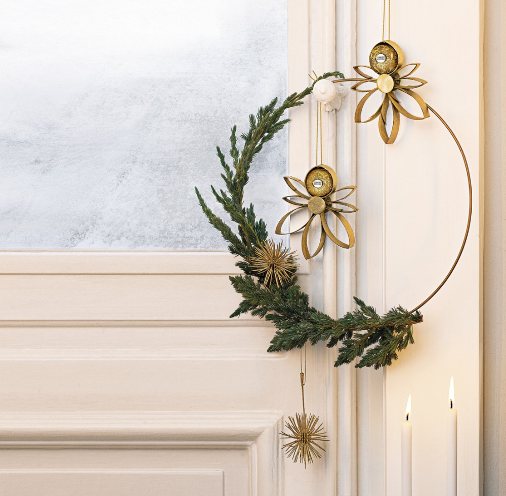 Stačí namotat zelené větvičky kolem kovového kruhu a z nastříhané papírové role vyrobit zlaté andílky. Elegantní vzhled jim dodáte pomocí jedinečných pralinek Ferrero Rocher. Andílky spolu s drobnými vánočními dekoracemi zavěste na předem ozdobený kruh a vneste do vašeho domova atmosféru Vánoc.