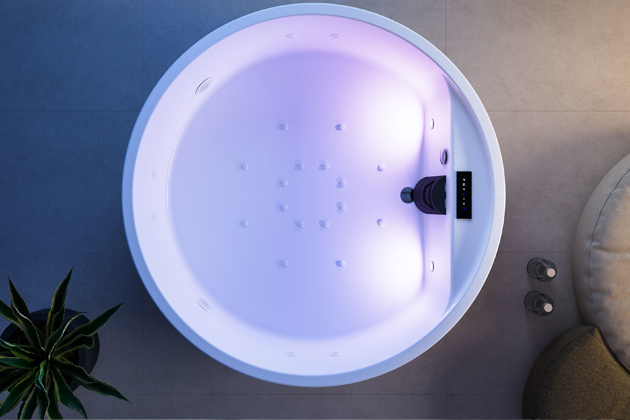 Přenosná vířivka Infinity 220 Overflow (Glass1989) s kruhovým vnitřním sezením, vybavená různými masážními zónami, jejíž technický systém se ukrývá pod jejím pláštěm, je přímo stvořená pro domácí wellness zážitek → www.ronalbathrooms.com/cs_cz