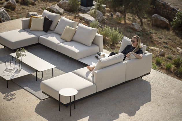 Modulární sedací souprava Dongo 3 (Todus), design Studio Segers, lakovaná ocel, rychleschnoucí pěna, outdoorová textilie, cena od 175 000 Kč → www.todus.cz