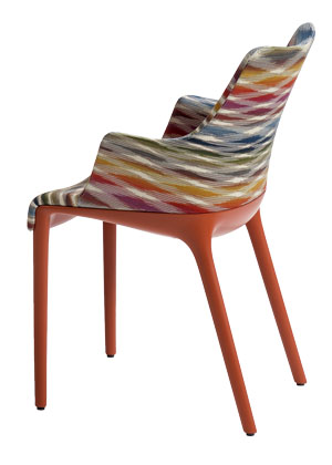 Foto: KartellŽidle Eleganza Nia Missoni (Kartell), design Philippe Starck, recyklovaný termoplastický technopolymer získaný z kapslí kávy Illy, textilie Missoni, polyuretanová pěna, cena 23 060 Kč → www.kartellshop.cz