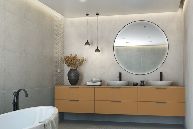 Stálicí na poli koupelnových trendů je bezesporu černá barva. Ta se spíš než pro velké plochy skvěle hodí k doplňkům. Pokud patříte mezi perfekcionisty, kteří vše rádi dotáhnou do posledního detailu, slaďte si jednotlivé prvky v koupelně důmyslně a jděte po černé! Kombinovat lze například umyvadlové doplňky s úchytkami či zrcadlem, možností je ale mnoho. „V koupelnách jsou stále oblíbené černé detaily. Velmi efektní je například kombinace černé kovové výpustě, rozetky přepadu či sifonu například s kulatým zrcadlem Oreo s černým rámem po obvodu,“ potvrzuje Ing. Petr Blažek z Dřevojasu a pokračuje: „Černé doplňky nábytku nabízíme jak u umyvadlových skříněk v podobě matných černých úchytek například na skříňkách řady Q Max, či těch zafrézovaných na nově upravené koupelnové řadě Bono, tak v podobě konzole pro zavěšení ručníků u umyvadlových desek.“ Černá jako kontrastní prvek totiž upoutá jak na bílých podkladech, tak i na skříňkách v dřevodekoru.