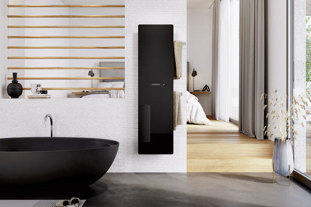 Zehnder Deseo Verso (Zehnder), elektrický skleněný radiátor v lesklém černém provedení s výsuvnými držáky na ručníky, cena na dotaz → www.zehnder.cz