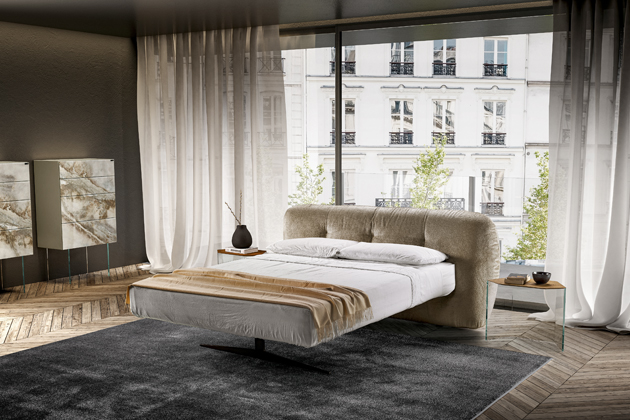 Postel Bounty 1807 (LAGO), design Daniele Lago, ocel s povrchovou úpravou Titanio Steel nebo Peltro Steel, textilie, kůže i umělá kůže, cena na dotaz → www.lago.cz