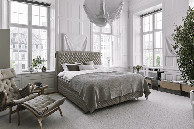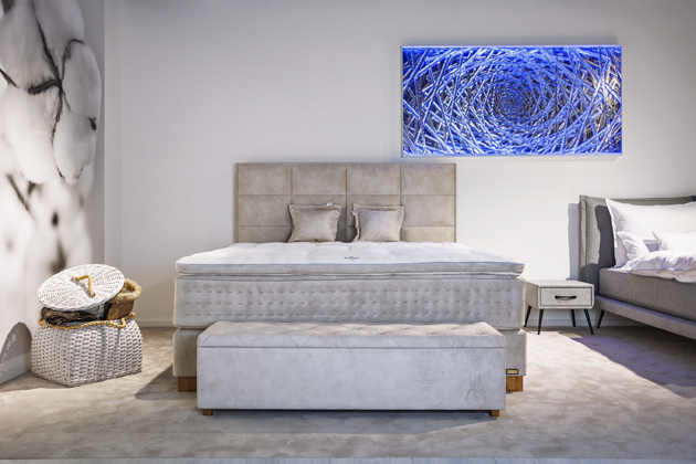 Postel Grand (Bernuss), bavlna, koňské žíně, taštičkové pružiny ze švédské oceli, skandinávská borovice, hedvábí, kašmír, potah damašek, cena 410 315 Kč → www.bernuss.com