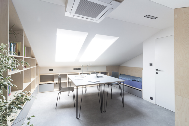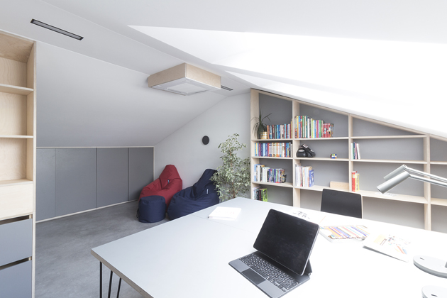 Do podkroví bytu vede schodiště z masivního dubového dřeva, doplněné zábradlím z ocelových kulatých tyčí v povrchové úpravě černý komaxit. Podkrovní pokoj, jediný v tomto patře, je navržen tak, aby vyhovoval potřebám obou dospívajících synů majitele. Stěny pokoje jsou v bílé barvě a podlaha z vinylového prkna s dezénem betonu. Místnost kombinuje pracovní prostředí s ložnicí a vyniká atypickým nábytkem z šedě lakované MDF desky a březové překližky. Podnože pracovních stolů pochází z kolekce renomovaných českých designérů Master&Master. Knihovna i polička podél nízké stěny pod okny byly přizpůsobeny zkoseným stropům podkroví a kopírují jejich tvar.