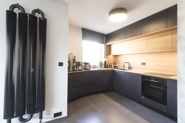 V druhé části místnosti se nachází prostorná kuchyňská linka ve tvaru U, která opět využívá dubovou dýhu a masiv v kombinaci s materiálem Valchromat v černé barvě na spodních dvířkách kuchyňské sestavy. Veškeré kuchyňské spotřebiče jsou vestavěné. Akcenty černé jsou využity například i u trouby na pečení či vodovodní baterie značky Bosch, což podtrhuje jednotný styl a design celé kuchyně.