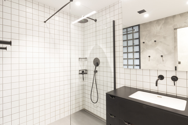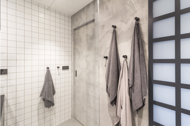 Koupelna je přístupná pouze z chodby posuvnými dveřmi s mušlí Minimal opět z kolekce kování M&T, která má v sobě integrovaný zámek pro možnost zamknutí. Jedna stěna včetně dveří je opatřena betonovou stěrkou, zatímco ostatní stěny jsou obloženy bílým dlážděným obkladem. Veškerý nábytek v koupelně, včetně baterií, sprchy a dalších doplňků, je proveden v kontrastní černé barvě. V tomto duchu je zařízena i toaleta, kdy z bílé vystupují černé detaily. Už jsme zmiňovali, že bytu vládne kočičí vládce, a proto i on musí mít svoji toaletu. Je rafinovaně uschovaná pod schody za poloprůhlednými kovovými dvířky s otvorem akorát velkým pro čtyřnohého mazlíčka.