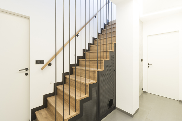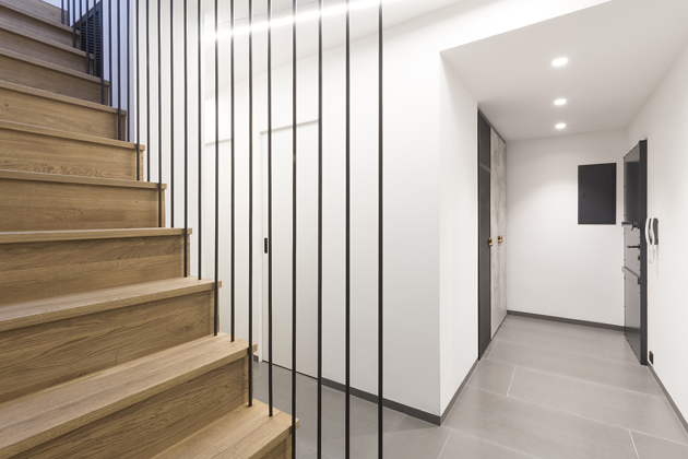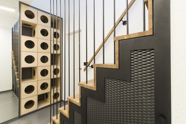 Foto: Beligi Design pro M&TPlechové vchodové dveře sladěné s klikou v industriálním stylu lze vnímat jako předzvěst toho, co se ukrývá za nimi. Klika je z produktové řady Rocksor od české manufaktury M&T. Architekt ji vybral především proto, že svým vzhledem připomíná klasický roxorový drát, běžně využívaný jako výplň do železobetonových konstrukcí. Hodí se tak nejen k samotným dveřím, ale i k celkovému industriálnímu designu, který dominuje v celém mezonetovém bytě. Vstupní prostor nabízí mimo jiné velkou skříň a zrcadla, která prostoru dodávají vzdušnost a světlo. Vedle nich však stojí nečekaná atrakce: dřevěná konstrukce, která na první pohled vypadá jako další praktický úložný nábytek. Při bližším zkoumání je však jasné, že se nejedná o botník, ale o originální prolézačku pro kočku. Má řadu propojených otvorů a úkrytů pro hru i odpočinek čtyřnohého člena rodiny a navíc nepřímo odhaluje, kdo je v tomto domě skutečným pánem.