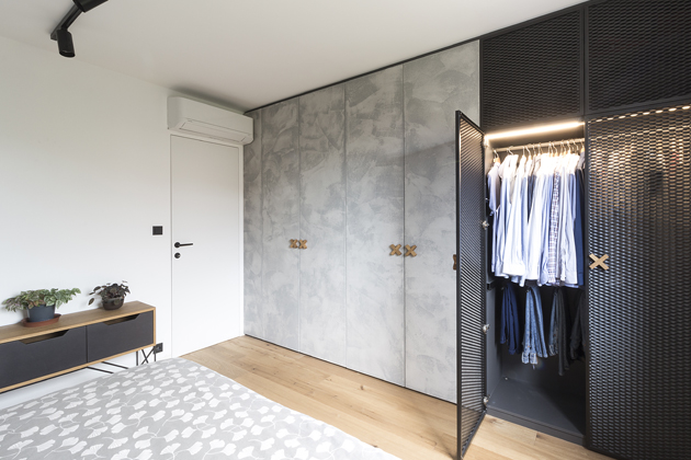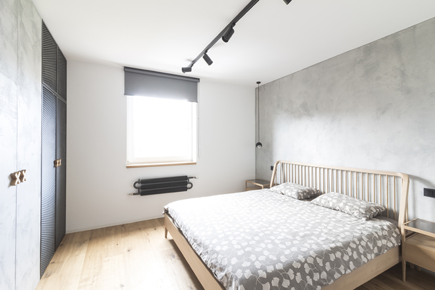 Ve spodním patře mezonetu se dále nachází ložnice majitele. Stěny jsou v bílé barvě a jedna z nich je opět ošetřena šedou betonovou stěrkou, která se tentokrát objevuje i na protilehlých šatních skříních. Hlavním designovým prvkem jsou právě tyto tři skříně. „Pro ložnici jsem zvolil nábytek s prvky industriálního stylu. Jedna ze skříní je vyrobena z tahokovu, který je poloprůhledný a vytváří tak zcela jedinečný efekt. Speciálně navržené úchytky ve tvaru X dodávají jednoduchému nábytku originální vzhled,“ upřesňuje Ing. Jindřich Vintr a dodává: „Pro realizaci těchto jedinečných prvků bylo nutné zadat výrobu atypického nábytku a zámečnické práce podle mého individuálního návrhu.“ Další vybavení ložnice tvoří dubová postel a noční stolky. Stejně jako v obývacím pokoji jsou zde závěsná černá svítidla nad nočními stolky i miniaturnější verze černého radiátoru se spirálou na bílé zdi.