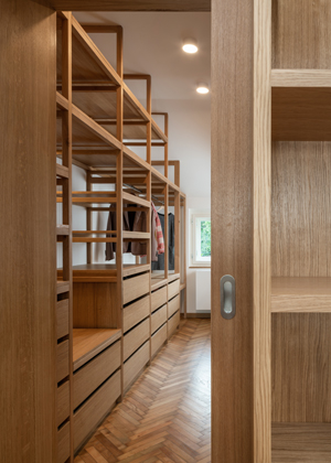Místem odpočinku je hlavní ložnice. V jejím centru je jednoduchá postel s ozdobným čelem potaženým látkou, dva originální noční stolky a nad nimi světla, totožná jako v kuchyni. Ložnice, i přes dostatečné úložné kapacity, skrývá další poklad. Za posuvnými dveřmi, opatřenými nerezovou mušlí z produktové řady NOVA od M&T, se otevírá prostorná šatna. Tato úložná místnost je strategicky přístupná jak z ložnice, tak z chodby, což zvyšuje její funkčnost a pohodlí užívání.