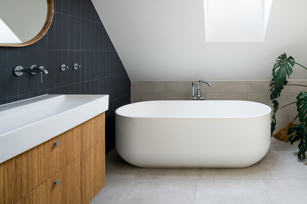 Foto: Studio Flusser pro M&T V horním patře domu se ještě nachází dvě prostorné koupelny pod zkoseným stropem. Estetika koupelen je definována kombinací černého obkladu a světlých tónů, doplněná o podlahu Sorrento White od Archceram, jejíž protiskluzové vlastnosti zvyšují bezpečnost. Každá z koupelen je vybavena toaletou, sprchovým koutem a bateriemi Essence New od renomovaného výrobce Grohe. Větší koupelna má navíc samostatně stojící vanu oválného tvaru. Střešní okno nad vanou vpouští nejen přirozené světlo, ale také umožňuje výhled na oblohu. Umyvadla a zrcadla v obou koupelnách jsou navržena tak, aby umožňovala pohodlné použití pro dvě osoby najednou.