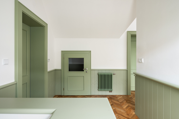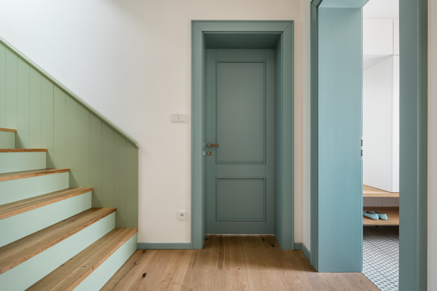 Do patra vede olivově barevně laděné schodiště a tento odstín se znovu objevuje na dveřích, obložení stěn a topení. Pozornost upoutají atypicky malé dveře: „Na počest původních stavitelů jsme přidali unikátní dveře vedoucí do dětského koutku plného fantazie, kam mohou dospělí jen pokorně na kolenou,“ usmívá se architekt ze studia No Architect. Ostatní dveře jsou běžné výšky zdobeny výraznou klikou. Ta je důkazem toho, že i takovýto detail může vhodně obohatit celkový vzhled prostoru. „Kliky vyrobené z nerezové oceli vynikají vysokou pevností i mechanickou odolností. Pro tyto vlastnosti je nerezová klika NOVA vhodná nejen pro použití do interiéru, ale hravě obstojí i na exteriérových – tedy vchodových dveřích,“ uvádí ke dveřnímu kování Roman Ulich, hlavní designér české rodinné manufaktury M&T, jediného českého výrobce designového dveřního a okenního kování. Na dveřích je použito kování s kulatou rozetou, u interiérových dveří s dozickým zámkem, na vchodových dveřích pak v bezpečnostní variantě.
