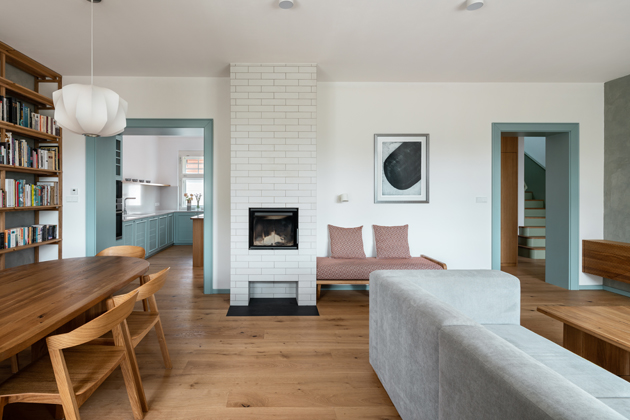 Celé přízemí je pokryto dřevěnou podlahou, která plynule spojuje jednotlivé místnosti bez nutnosti přerušení dveřními prahy, což dává jednotící efekt. Hřejivé dřevo doplňují ledové odstíny barev v celém prostoru. Dveře i zárubně zůstávají tyrkysové, většina stěn nese bílou, vyjma té za televizí a knihovnou, která přechází do šedé stěrky. Jde o prvek, který rozbíjí jednotnost stěn a prostor příjemně ozvláštní. Centrem obývacího prostoru je krb z bílých cihel. Podél stěny u jídelního koutu je obrovská knihovna naplněna knihami různých žánrů. A ta samozřejmě potřebuje čtecí koutek, který přímo navazuje na krb. Dostal podobu pohodlné červeně polstrované lavice s polštářky ve stejné barvě, včetně šikovně umístěného světla pro pohodlné čtení. Na protější straně je lavice v podobném duchu, opět s červenou sedací částí. Opěrka je sice stejná, ale v šedé barvě, a tím navazuje na sedačku Neff od českého výrobce Polstrin, která směřuje k televizní části, jasně ukazující, že jsme v 21. století. Místo obývací stěny je pod televizí podél celé stěny sedm na sebe navazujících skříněk, s vyfrézovaným vybroušeným dekorem.