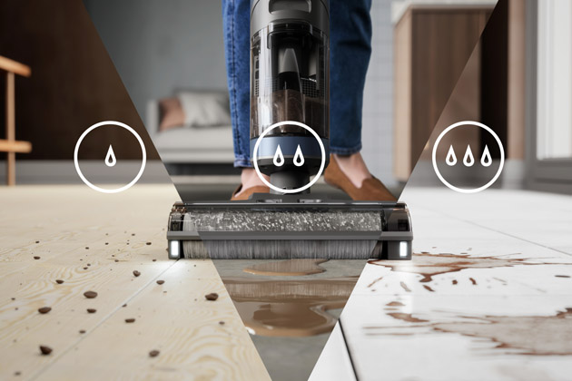Infračervená technologie napomáhá detekci špíny a v závislosti na výsledcích upravuje sací výkon a použité množství vody.